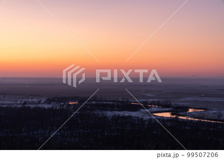 夕暮れ時の凍てつく冬の釧路湿原