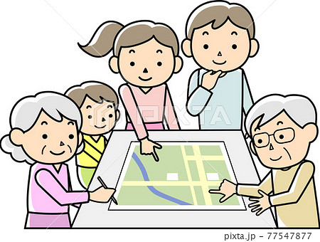 我が家の避難場所を確認する家族