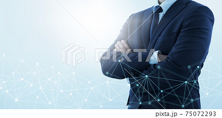 腕組みをし、自信に満ちたビジネスマン。ネットワーク構造と逆光。