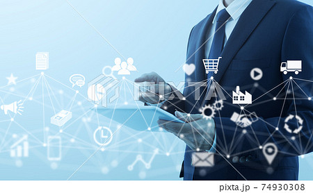 経営とネットワークテクノロジー。タブレットPCを使うスーツの男性。ネットワーク構造とビジネスアイコン