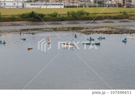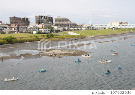 干潮で現れた干潟とボートを楽しむ人々(江戸川放水路)