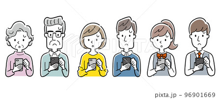 ベクターイラスト素材:スマホを使う学生の男女、困る