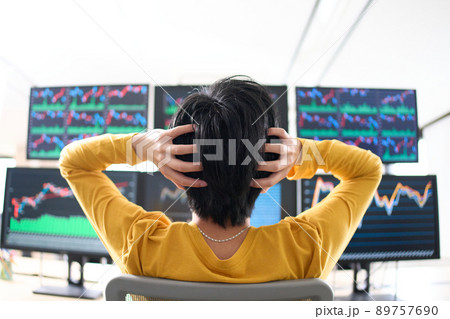 マルチモニターの画面を見つめるビジネスパーソン トレーダー イメージ