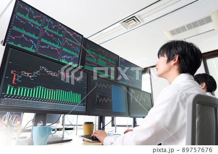 マルチモニターのチャートを見つめる若いビジネスパーソン トレーダー 投資家 イメージ