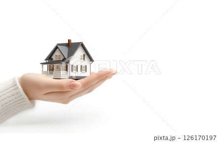 住宅の模型を手に乗せる女性。住宅保険や不動産広告、住宅ローンのイメージ素材