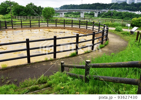 相模原市立史跡田名向原遺跡公園の野外展示(旧石器時代住居状遺構)と新緑