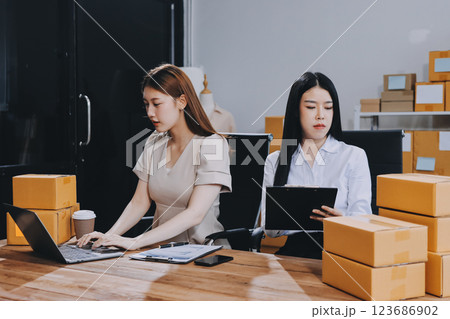 Startup SME small business entrepreneur of freelance Asian woman using a laptop with box Cheerful success Asian woman her hand lifts up online marketing packaging box and delivery SME idea concept