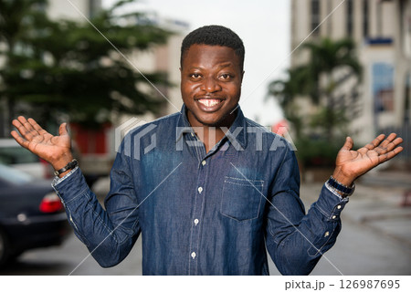 happy businessman standing in town with open arms