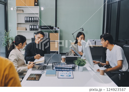 Cheerful meeting room, businesspeople celebrate with handshaking. Successful project was completed before the deadline. Business partnership and collaboration in project management. Habiliment