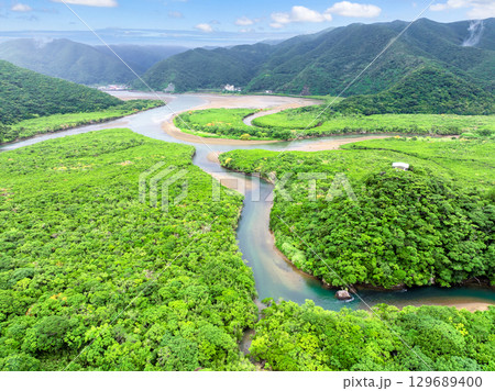 奄美大島 マングローブ原生林 - 鮮やかな真夏の木々と川の色の空撮