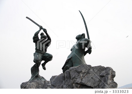 武蔵と小次郎 決闘の像の「宮本武蔵」(巌流島(船島)/山口県下関市大字彦島字船島)