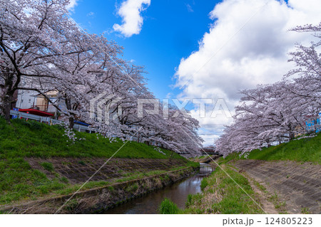2025年春 満開になった奈良佐保川の桜並木と青空 雄大な雲と桜①