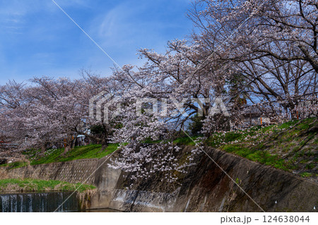 2025年春 満開になった奈良佐保川の桜並木と青空 佐保の流れと堤防の桜③
