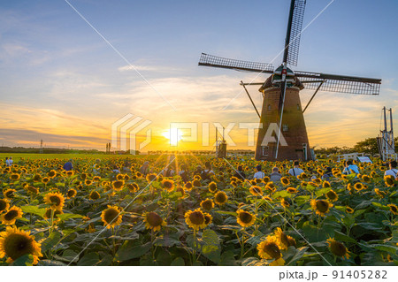 ひまわりと風車の夏風景(佐倉ふれあい広場)