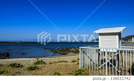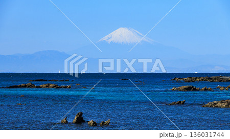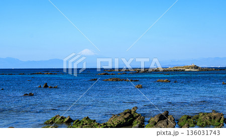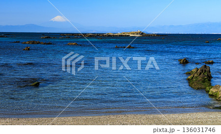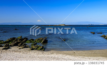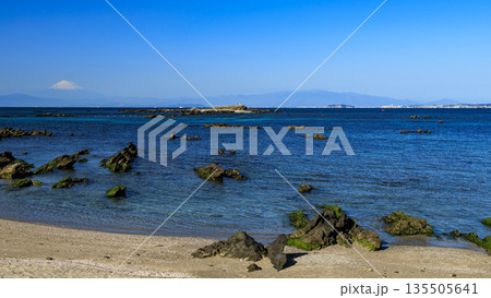 神奈川県三浦半島 【春】 天神島の砂浜と富士山
