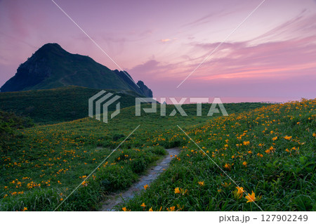 新潟県佐渡市 佐渡島 夕暮れの大野亀トビシマカンゾウ群生