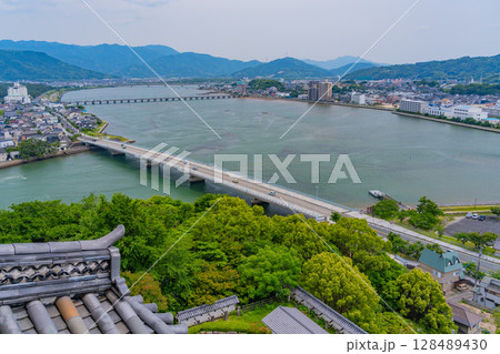 (佐賀県)唐津城天守から見下ろす、舞鶴橋と松浦川