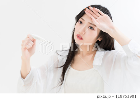 体温計を持つ女性 頭痛 頭が痛い ネガティブイメージ 女性 ポートレート 20代 30代