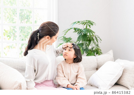 子供の熱を測るママ