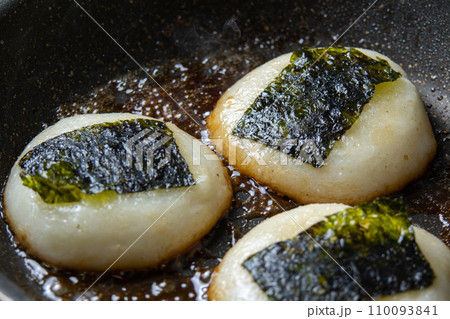 餅(丸餅)の磯辺焼き調理シーン。余った餅リメイクイメージ。
