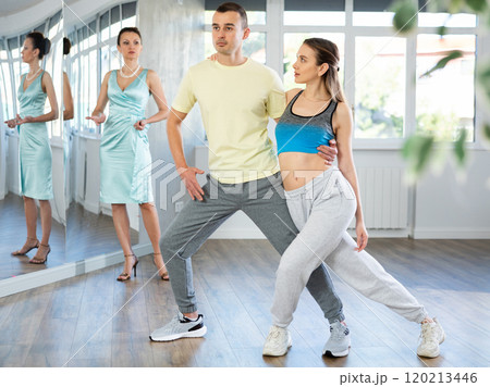 Couple in comfortable sports clothes learns tango dancing during individual lesson