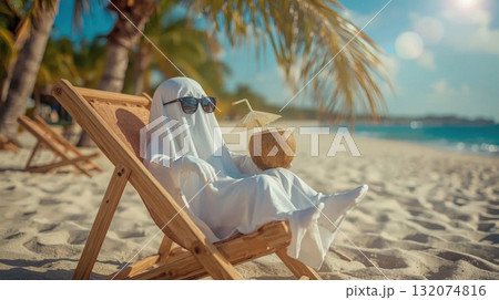 Ghostly figure in sunglasses relaxing on a beach chair, enjoying a tropical drink with an umbrella, surrounded by palm trees and sandy shores, embodying a playful Halloween celebration concept