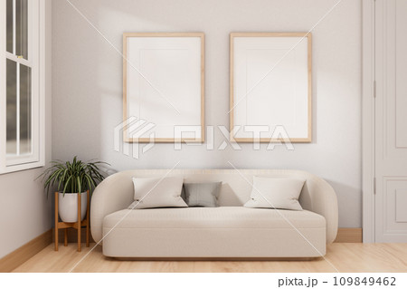 A cosy modern, Scandinavian living room with a white couch, picture frames mockup on a white wall.