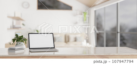 A white-screen laptop computer and stationery on a white marble table in a modern living room.
