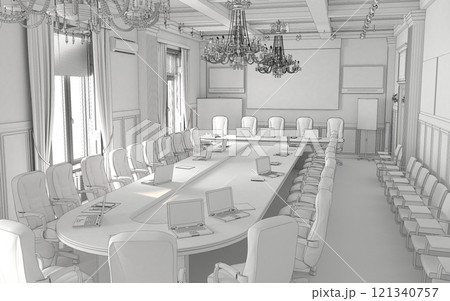 conference room, meeting room, contour visualization, 3D illustration, sketch, outline