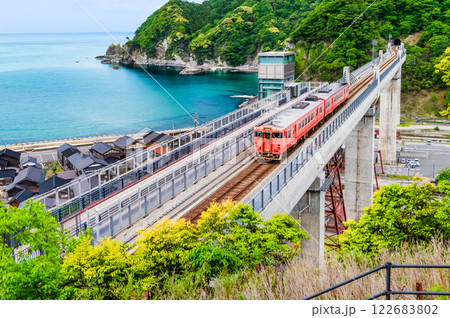 関西・近畿・餘部駅(余部駅)・空を飛ぶような余部鉄橋を渡って行く山陰本線の車両・兵庫県香美町(1)