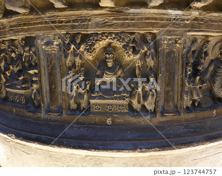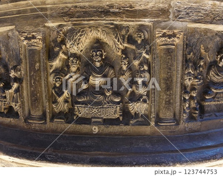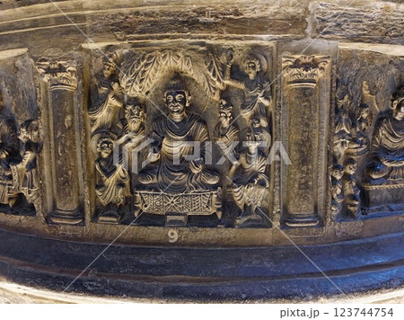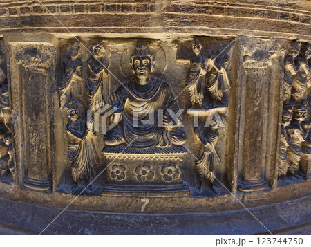 パキスタンの古都ラホールにある博物館に展示される小仏塔の周囲に配された釈迦の生涯をテーマにした彫刻