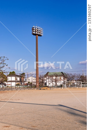 放課後の静かな土のグラウンドとサッカーゴール、日本のアニメ風の風景(部活・ノスタルジー)