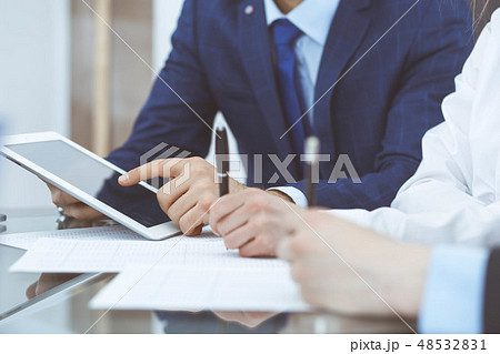 Businessman using laptop at meeting, closeup of hands. Business operations concept