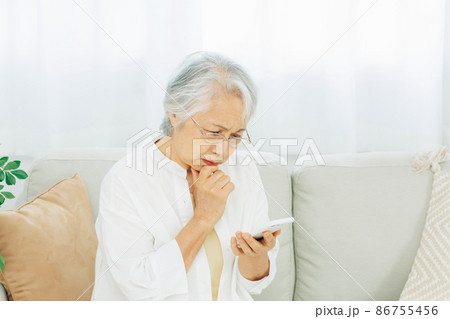 家でパソコンを使いながら困る高齢者女性(故障・修理・詐欺・悩む)