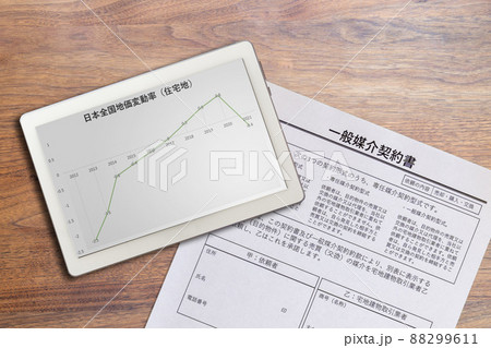 日本全国住宅地価変動率グラフと不動産一般媒介契約書