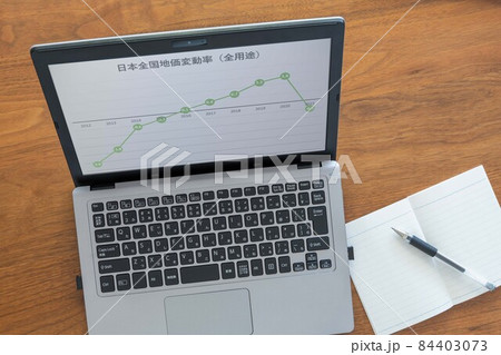 パソコンモニターに映る日本全国地価変動率(住宅地)推移グラフ