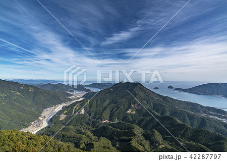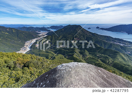 伊紀伊半島の三重県熊野市木本町のユネスコ世界遺産の熊野古道付近の便石山(像の背)と尾鷲湾と青空
