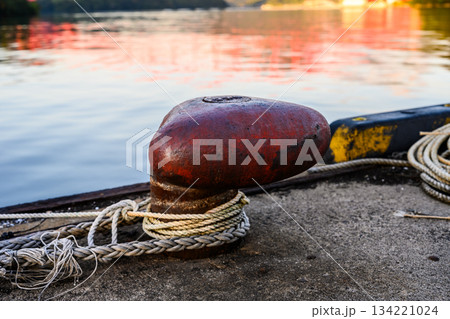 港の岸壁に佇む古い係船柱と繋留ロープの質感