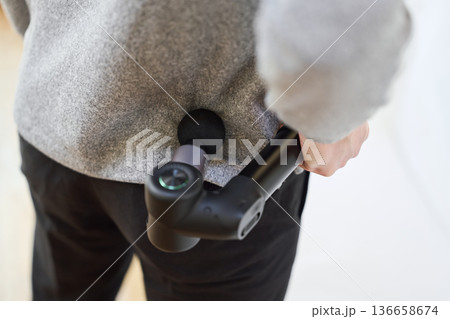 腰にマッサージガンを当てるアジア人シニア男性