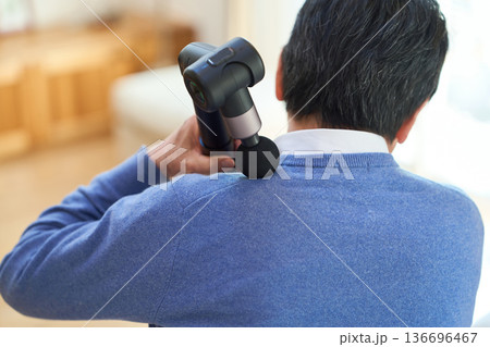 肩にマッサージガンを当てるアジア人シニア男性