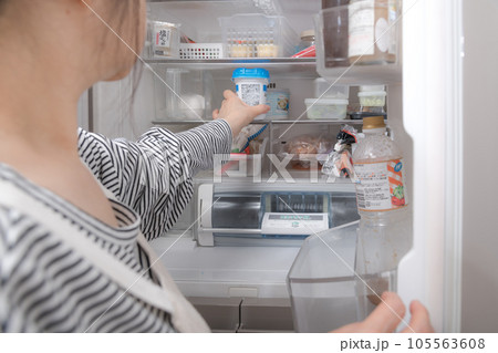【冷蔵室から唐揚用の下味を付けた鶏肉を出す主婦】