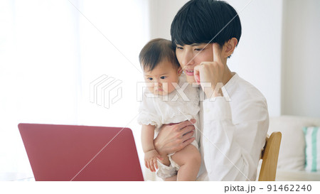 赤ちゃんを抱っこしながら自宅で仕事する女性 子育てしながらの在宅勤務