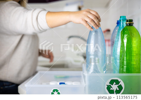 A beautiful woman puts a plastic bottle into a box with a recycling sign. Sorting plastic at home in the kitchen. A woman puts plastic bottles in a box for recycling.