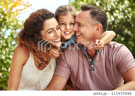 Smile, family and child hug outdoor with bonding, care or support for security trust at home backyard in summer. Woman, man and girl for embrace moment, love and sunshine vacation of childhood memory