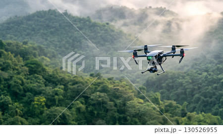 A drone uses AI tracking systems to monitor animals in a lush wildlife preserve. Great for conservation, research, and environmental themes.
