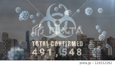 Image of biohazard sign, number of cases and covid 19 cells floating over cityscape