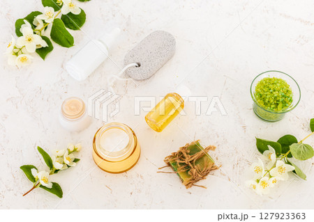 Concept flat lay of facial and body care cosmetics with pink sea salt, soap, massager, towel