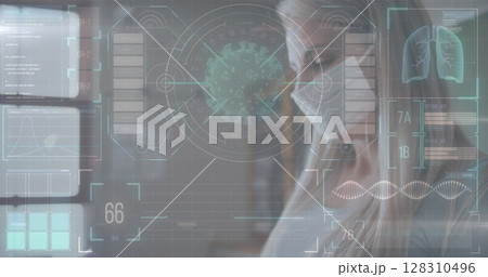 Image of 3d covid 19 cells floating over doctors wearing face masks