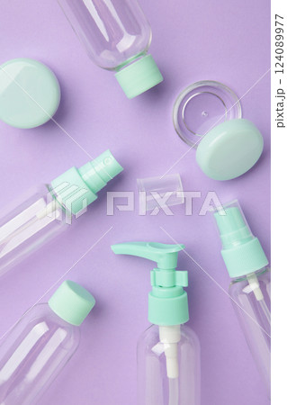 Empty travel cosmetic bottles on purple background. Minimalist bodycare beauty products for vacation or journey. Top view. Copyspace.