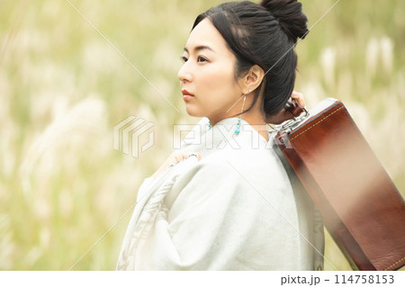 グレイヘアの女性 横向き 縦 全身